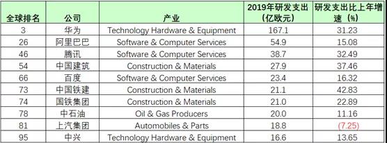 其實(shí)中國(guó)有10家公司進(jìn)入了前100名,分別是華為全球第3,阿里巴巴第26,騰訊第46。