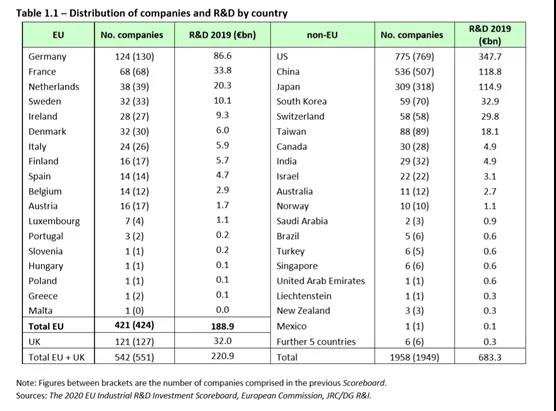 前不久,歐盟公布了2020年全球企業(yè)研發(fā)支出2500強(qiáng),當(dāng)然雖然標(biāo)題是2020,但是其實(shí)使用的是2019年的全年數(shù)據(jù),這也是這個(gè)歐盟報(bào)告一貫的風(fēng)格。