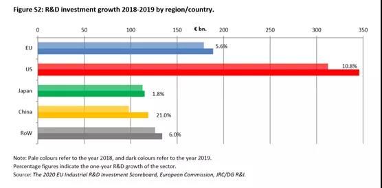 2019年的研發(fā)支出增長(zhǎng)速度,美國(guó)10.8%,歐盟5.6%,中國(guó)21%,日本1.8%,RoW(全球其他國(guó)家)增長(zhǎng)6.0%。