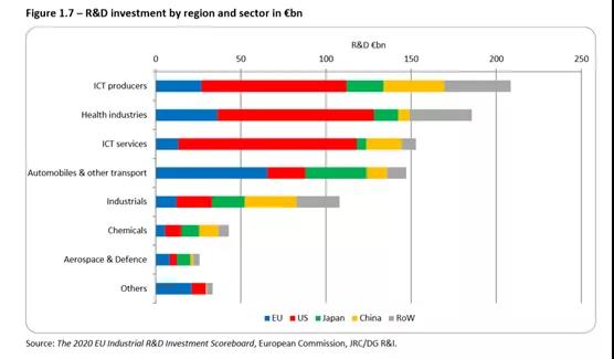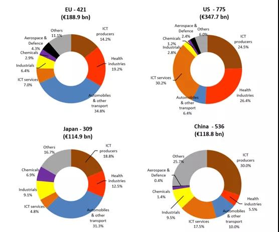其他的主要產(chǎn)業(yè)還有化工,航空航天,冶金和設(shè)備制造業(yè),但是研發(fā)支出完全無(wú)法和上述的四個(gè)產(chǎn)業(yè)相比,最高的也就是494億歐元。