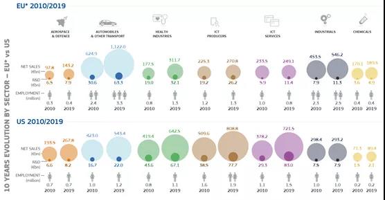 可以看出,歐洲2019年比2010年?duì)I收有明顯增幅的,主要是汽車(chē)行業(yè),醫(yī)療行業(yè)和航空航天產(chǎn)業(yè),其中歐洲的投資增量最大是在汽車(chē)產(chǎn)業(yè),醫(yī)療和航空航天也有較大增幅,但是基數(shù)較小,另外可以看出歐洲在ICT產(chǎn)業(yè)方面確實(shí)發(fā)展較慢,落后于中美。