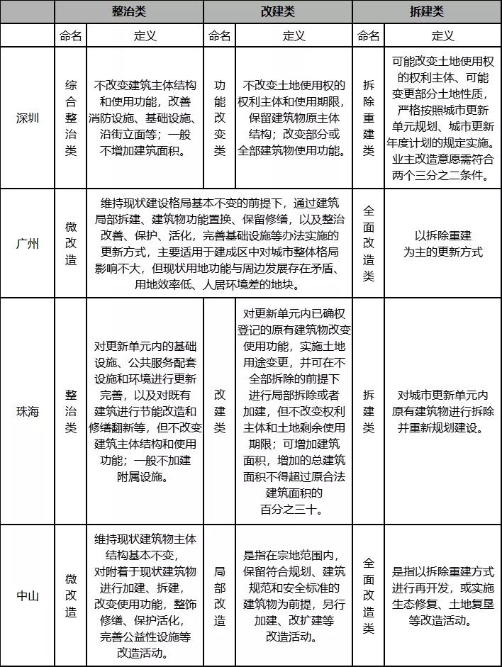按照改造力度由弱到強(qiáng),城市更新項(xiàng)目可分為整治類、改建類和拆建類三種類型。不同城市命名略有不同,但實(shí)質(zhì)相近,例如深圳將城市更新項(xiàng)目分為綜合整治類、功能改變類和拆除重建類(分別對應(yīng)整治、改建和拆建);廣州分為全面改造(對應(yīng)拆建)和微改造(對應(yīng)整治和改建);中山分為微改造、局部改造和全面改造(分別對應(yīng)整治、改建和拆建)。