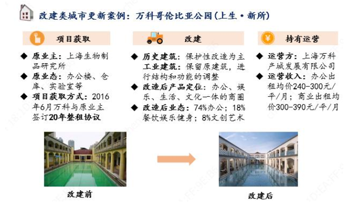 改建類項(xiàng)目改造力度居中、一般需由市級城市更新管理部門審批,房企一般可通過改造、持有運(yùn)營的等方式參與項(xiàng)目。改建類項(xiàng)目一般不改變土地使用權(quán)的權(quán)力主體和使用期限,在不全部拆除的前提下進(jìn)行局部拆除或加建,可實(shí)施土地用途變更,部分城市可增加建筑面積(但一般會對建筑面積增幅設(shè)限,例如珠海要求不超過30%)。房企可通過改造、持有運(yùn)營等方式參與項(xiàng)目,代表案例如萬科上海哥倫比亞公園。