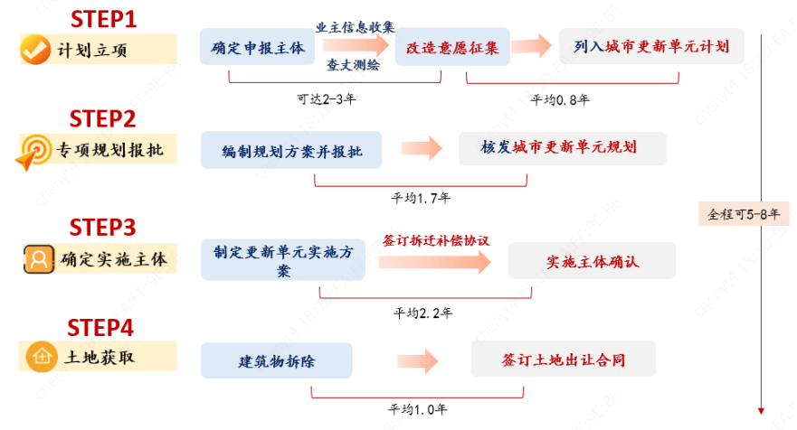 本部分重點(diǎn)討論房企參與較多的拆建類城市更新項(xiàng)目流程。拆建類城市更新項(xiàng)目分為四大步驟,(1)計(jì)劃立項(xiàng)、(2)專項(xiàng)規(guī)劃報(bào)批、(3)實(shí)施主體確認(rèn)和(4)土地獲取,完成四個(gè)步驟耗時(shí)可達(dá)5-8年,流程越靠前項(xiàng)目不確定性越高。