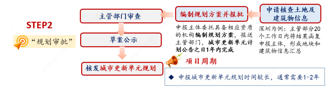 指“城市更新單元規(guī)劃”的編制和審批,通常需在立項(xiàng)公告后一定時(shí)限內(nèi)完成方案報(bào)送,如深圳要求1年。在這一流程中,申報(bào)主體一般首先向主管部門申請核查土地及建筑物信息,再聘請有資質(zhì)的規(guī)劃設(shè)計(jì)單位編制規(guī)劃方案,并與規(guī)劃國土部門深入溝通、報(bào)審,以獲得對公司有利的批復(fù)指標(biāo)。專項(xiàng)規(guī)劃報(bào)批是房企就容積率、配建要求等與政府進(jìn)行博弈的過程,通常需要耗時(shí)1-2年。