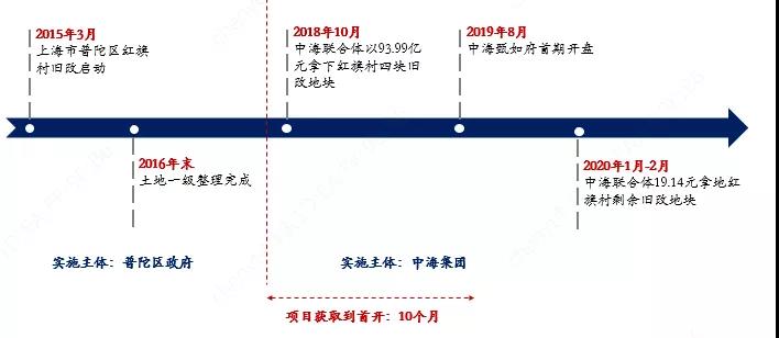 2018年10月,上海海升環(huán)盛房地產(chǎn)開發(fā)有限公司(以下簡稱聯(lián)合體)以93.99億元地價(jià)摘得紅旗村四塊地,該公司由中海地產(chǎn)、上海中環(huán)投資開發(fā)(集團(tuán))有限公司、上海新長征(集團(tuán))有限公司聯(lián)合成立(實(shí)控人為普陀區(qū)長征鎮(zhèn)農(nóng)村集體資產(chǎn)管理委員會),持股比例分別為70%、20%、10%;2020年1月-2月,聯(lián)合體再以19.14億元拿下紅旗村剩余舊改地塊。出讓地塊要求競得人配建租賃房、保障房、廣場、公共設(shè)施、社區(qū)配套設(shè)施等,同時(shí)商辦項(xiàng)目要求全部自持,且需引入企業(yè)總部、研發(fā)中心、科技創(chuàng)新、現(xiàn)代商貿(mào)等符合普陀區(qū)產(chǎn)業(yè)定位的企業(yè)。2019年8月,中海甄如府首期開盤,項(xiàng)目從拿地到首開僅10個(gè)月。