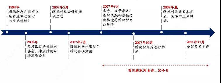 2007年9月,富力、合景泰富、新鴻基聯(lián)合以46億的價(jià)格競得獵德村西片區(qū)商業(yè)地塊,其中約25億用作拆遷款安置及新樓建設(shè)款,10億用于投資村南酒店。2007年10月獵德村開始進(jìn)行拆遷,2009年底拆遷基本完成,2010年初回遷戶回遷至原村東片區(qū)。