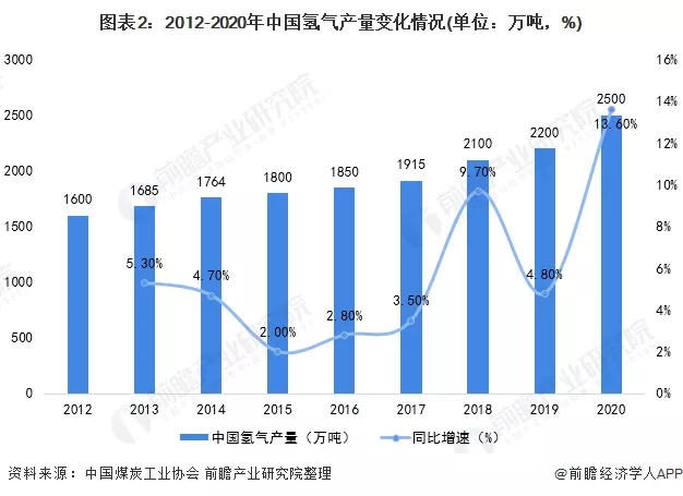 經(jīng)過十余年的長(zhǎng)足發(fā)展,我國(guó)氫氣年產(chǎn)量已逾千萬(wàn)噸規(guī)模,位居世界第一大產(chǎn)氫國(guó)。據(jù)中國(guó)煤炭工業(yè)協(xié)會(huì)數(shù)據(jù)統(tǒng)計(jì),2012-2020年,中國(guó)氫氣產(chǎn)量整體呈穩(wěn)步增長(zhǎng)趨勢(shì)。其中2019年-2020年,同比增速最為顯著,達(dá)到13.6%,且2020年,中國(guó)氫氣產(chǎn)量超過2500萬(wàn)噸。