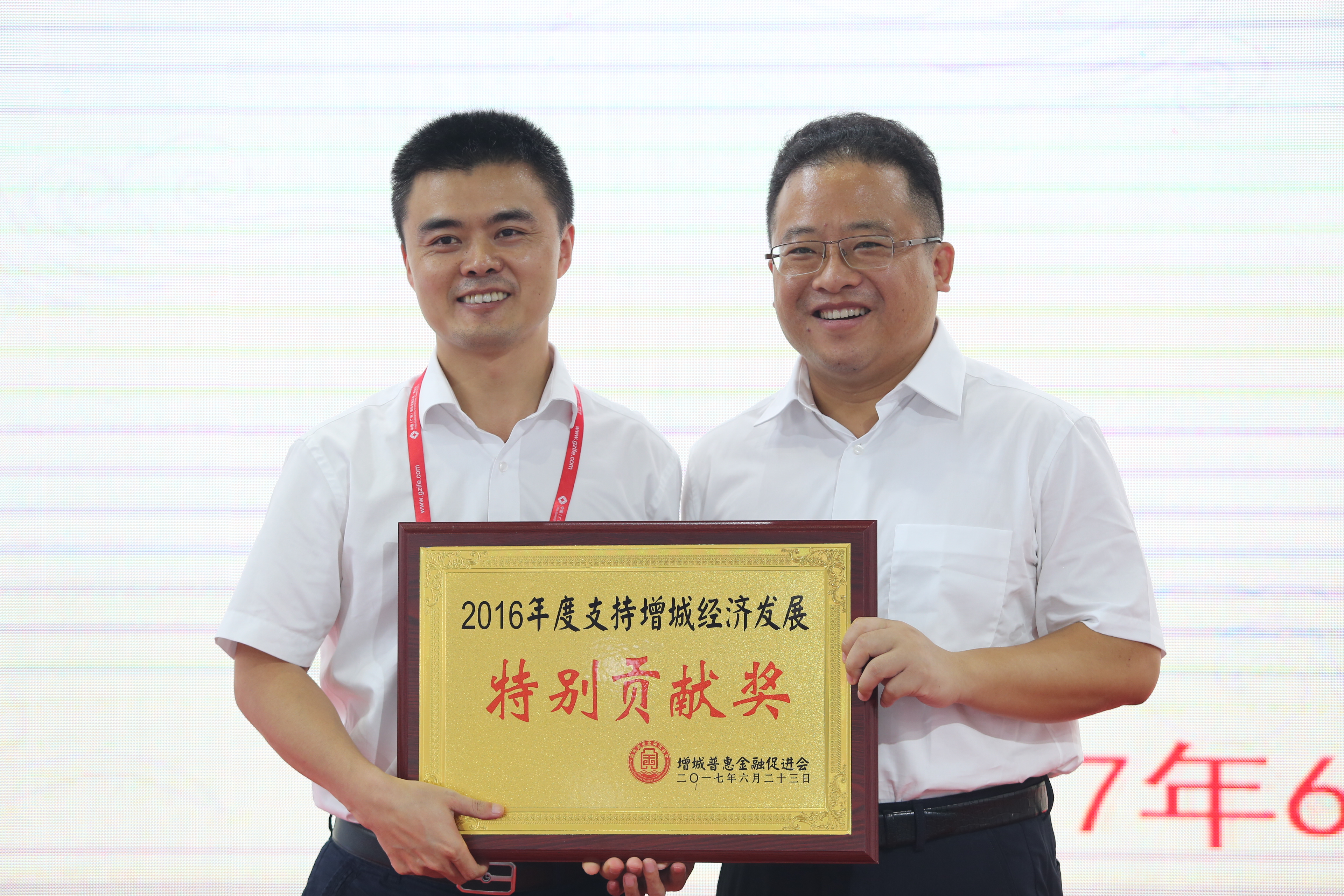 增城區(qū)發(fā)改金融局局長(zhǎng)袁俸農(nóng)(左)頒發(fā)特別貢獻(xiàn)獎(jiǎng),南粵基金集團(tuán)董事長(zhǎng)林濤(右)代表領(lǐng)獎(jiǎng)