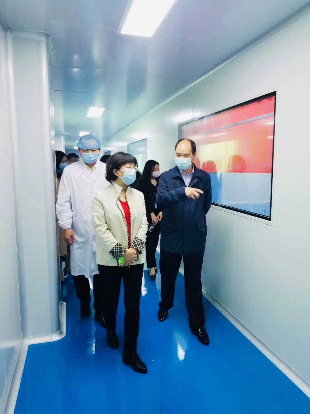 曾金賢總裁(右)陪同劉梅主席(中)考察口罩生產車間