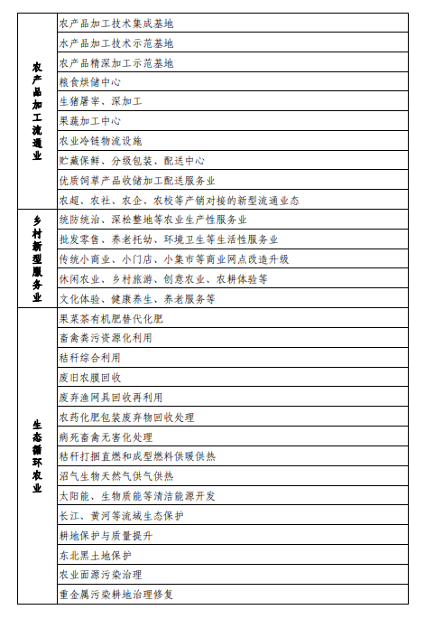 (四)農(nóng)產(chǎn)品加工流通業(yè)。鼓勵(lì)社會(huì)資本參與糧食主產(chǎn)區(qū)和特色農(nóng)產(chǎn)品優(yōu)勢(shì)區(qū)發(fā)展農(nóng)產(chǎn)品加工業(yè),提升行業(yè)機(jī)械化、標(biāo)準(zhǔn)化水平,助力建設(shè)一批農(nóng)產(chǎn)品精深加工基地和加工強(qiáng)縣。鼓勵(lì)社會(huì)資本聯(lián)合農(nóng)民合作社和家庭農(nóng)場(chǎng)發(fā)展農(nóng)產(chǎn)品初加工,建設(shè)一批專業(yè)村鎮(zhèn)。統(tǒng)籌農(nóng)產(chǎn)品產(chǎn)地、集散地、銷地批發(fā)市場(chǎng)建設(shè),加強(qiáng)農(nóng)產(chǎn)品倉儲(chǔ)保鮮冷鏈物流體系建設(shè),建設(shè)一批貯藏保鮮、分級(jí)包裝、冷鏈配送等設(shè)施設(shè)備,提高冷鏈物流服務(wù)效率和質(zhì)量,打造農(nóng)產(chǎn)品物流節(jié)點(diǎn),發(fā)展農(nóng)超、農(nóng)社、農(nóng)企、農(nóng)校等產(chǎn)銷對(duì)接的新型流通業(yè)態(tài)。支持社會(huì)資本參與現(xiàn)代農(nóng)業(yè)產(chǎn)業(yè)園、農(nóng)村產(chǎn)業(yè)融合發(fā)展示范園、農(nóng)業(yè)產(chǎn)業(yè)強(qiáng)鎮(zhèn)建設(shè)。