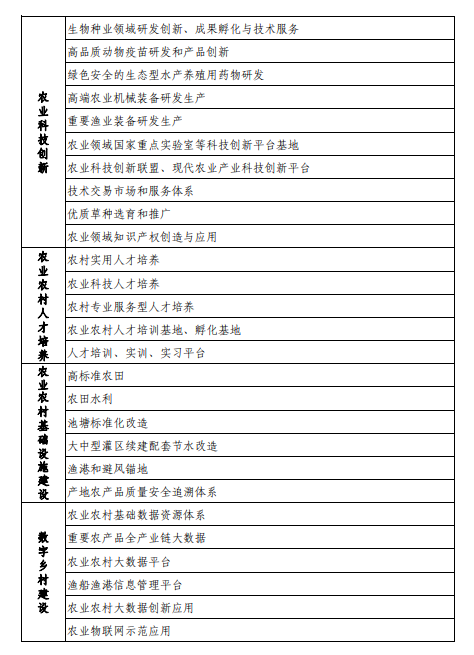 (七)農(nóng)業(yè)科技創(chuàng)新。鼓勵(lì)社會(huì)資本創(chuàng)辦農(nóng)業(yè)科技創(chuàng)新型企業(yè),參與實(shí)施農(nóng)業(yè)關(guān)鍵核心技術(shù)攻關(guān)行動(dòng),開展生物種業(yè)、重型農(nóng)機(jī)、漁業(yè)裝備、智慧農(nóng)業(yè)、綠色投入品、漁具標(biāo)識(shí)和玻璃鋼等新材料漁船等領(lǐng)域的研發(fā)創(chuàng)新、成果轉(zhuǎn)化與技術(shù)服務(wù)。鼓勵(lì)社會(huì)資本牽頭建設(shè)農(nóng)業(yè)領(lǐng)域國家重點(diǎn)實(shí)驗(yàn)室等科技創(chuàng)新平臺(tái)基地,參與農(nóng)業(yè)科技創(chuàng)新聯(lián)盟、國家現(xiàn)代農(nóng)業(yè)產(chǎn)業(yè)科技創(chuàng)新中心等建設(shè),打造產(chǎn)學(xué)研用深度融合平臺(tái)。引導(dǎo)社會(huì)資本發(fā)展技術(shù)交易市場(chǎng)和服務(wù)機(jī)構(gòu),提供科技成果轉(zhuǎn)化服務(wù),加快先進(jìn)實(shí)用技術(shù)集成創(chuàng)新與推廣應(yīng)用。