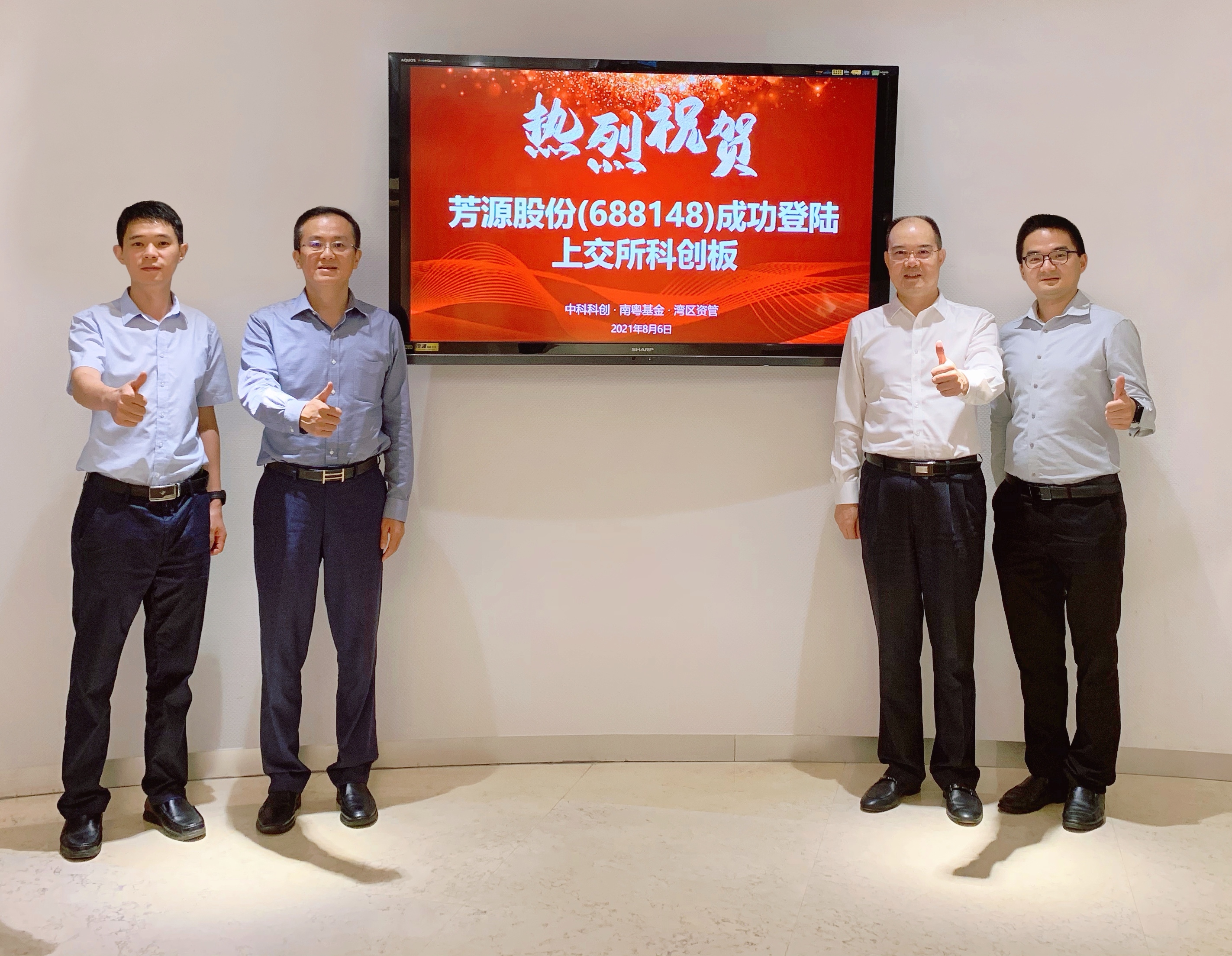曾金賢總裁(右二)與中科科創(chuàng)總經(jīng)理謝勇(左二)為芳源股份點(diǎn)贊祝賀