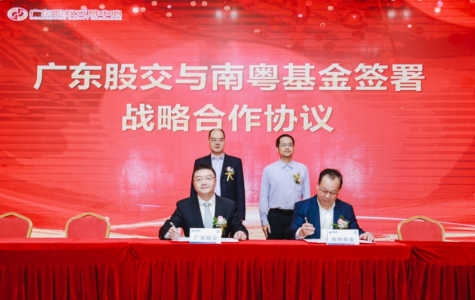 在許松輝副局長(zhǎng)(后排右)、曾金賢總裁(后排左)見證下,廣東股交副總經(jīng)理李潤(rùn)才(前排左)與陳曉光副總裁代表雙方簽約