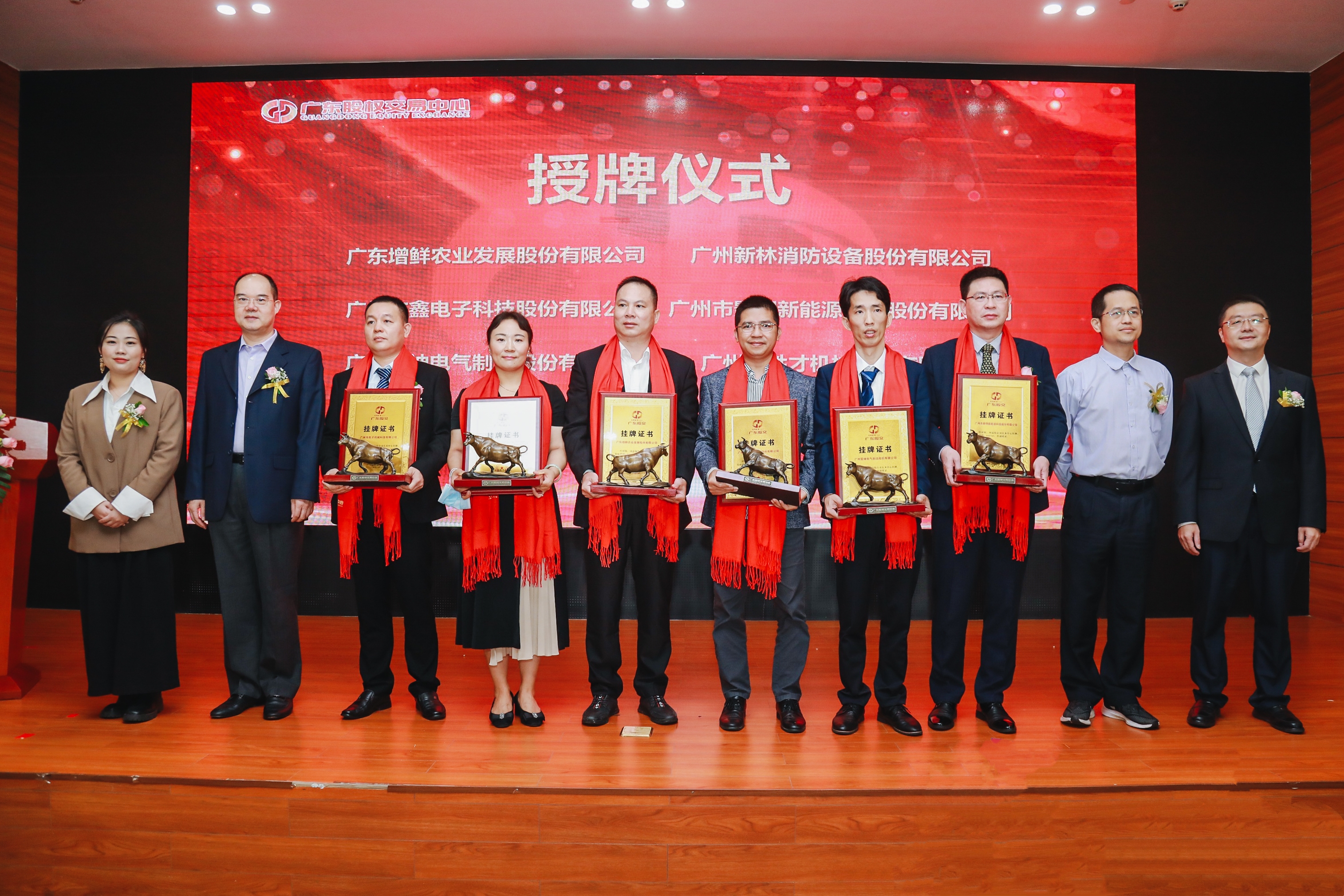 活動(dòng)現(xiàn)場(chǎng),曾金賢總裁與許松輝副局長(zhǎng)、李潤(rùn)才副總經(jīng)理、楊聲霖執(zhí)行董事等,共同為廣東文龍化工股份有限公司等12家企業(yè)頒發(fā)掛牌證書并贈(zèng)送紀(jì)念銅牛,并見證掛牌企業(yè)敲鐘鳴鑼向資本市場(chǎng)邁出第一步。增城區(qū)發(fā)改局、南粵國(guó)投分別做了資本市場(chǎng)相關(guān)政策解讀和融資產(chǎn)品介紹主題演講。