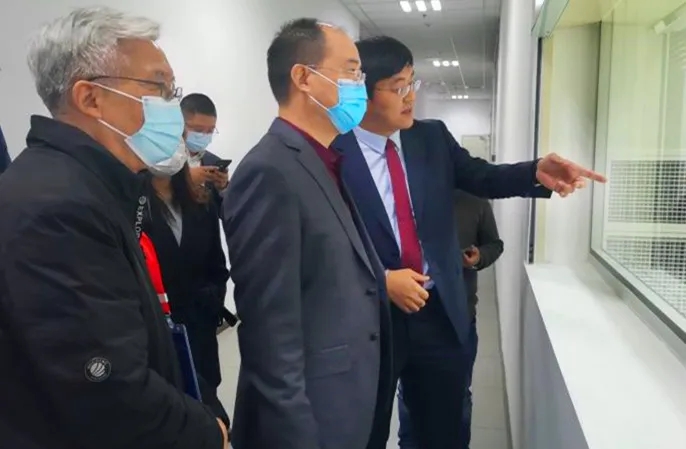 中國科學院院士歐陽鐘燦(左)、南粵基金總裁曾金賢(中)在恒美光電黃源董事長陪同下考察偏光片產線