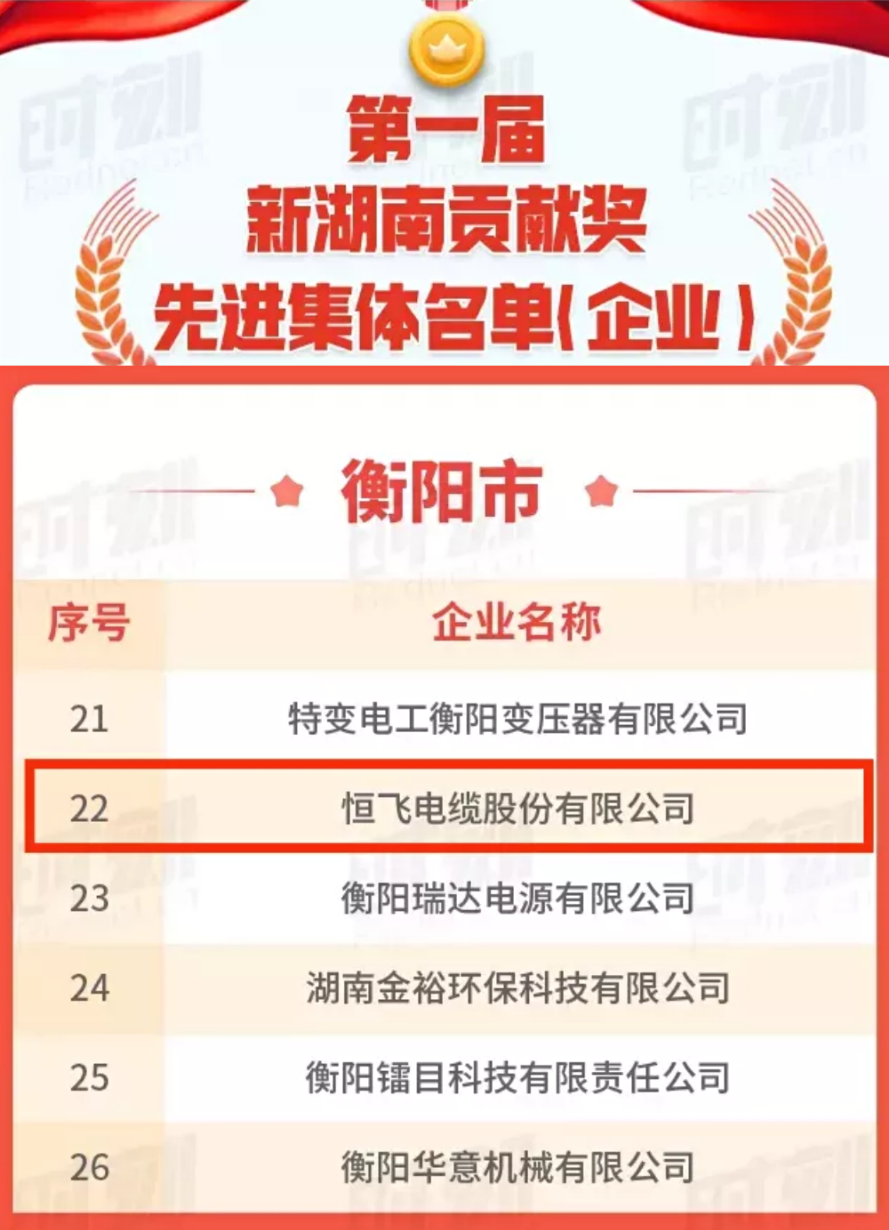 新年伊始,萬象更新。湖南省政府近日發(fā)布了《中共湖南省委湖南省人民政府關(guān)于表彰第一屆新湖南貢獻(xiàn)獎(jiǎng)先進(jìn)集體和先進(jìn)個(gè)人的決定》和2021“三湘民營企業(yè)百強(qiáng)榜”名單,其中,南粵基金投資企業(yè)恒飛電纜股份有限公司(簡稱“恒飛電纜”)榮獲第一屆“新湖南貢獻(xiàn)獎(jiǎng)先進(jìn)集體”,并榮登“2021三湘民營企業(yè)百強(qiáng)榜單”。
