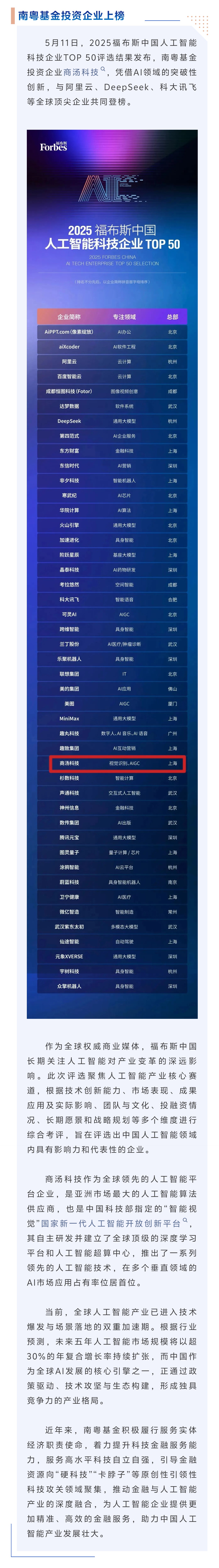 福布斯中國AI企業(yè)50強(qiáng)!南粵基金投資企業(yè)上榜