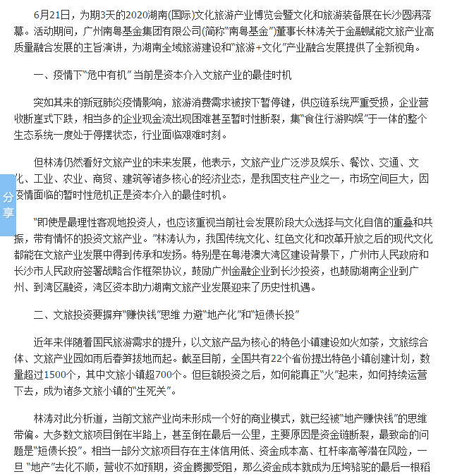 中國(guó)網(wǎng)|南粵基金董事長(zhǎng)林濤:金融賦能文旅產(chǎn)業(yè)高質(zhì)量融合發(fā)展
